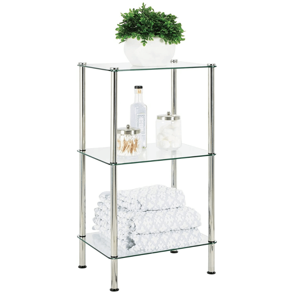 This compact vertical storage shelf features three easy-reach open front glass shelves, perfect for storing bathroom essentials, family photos, collectibles, books, and more.