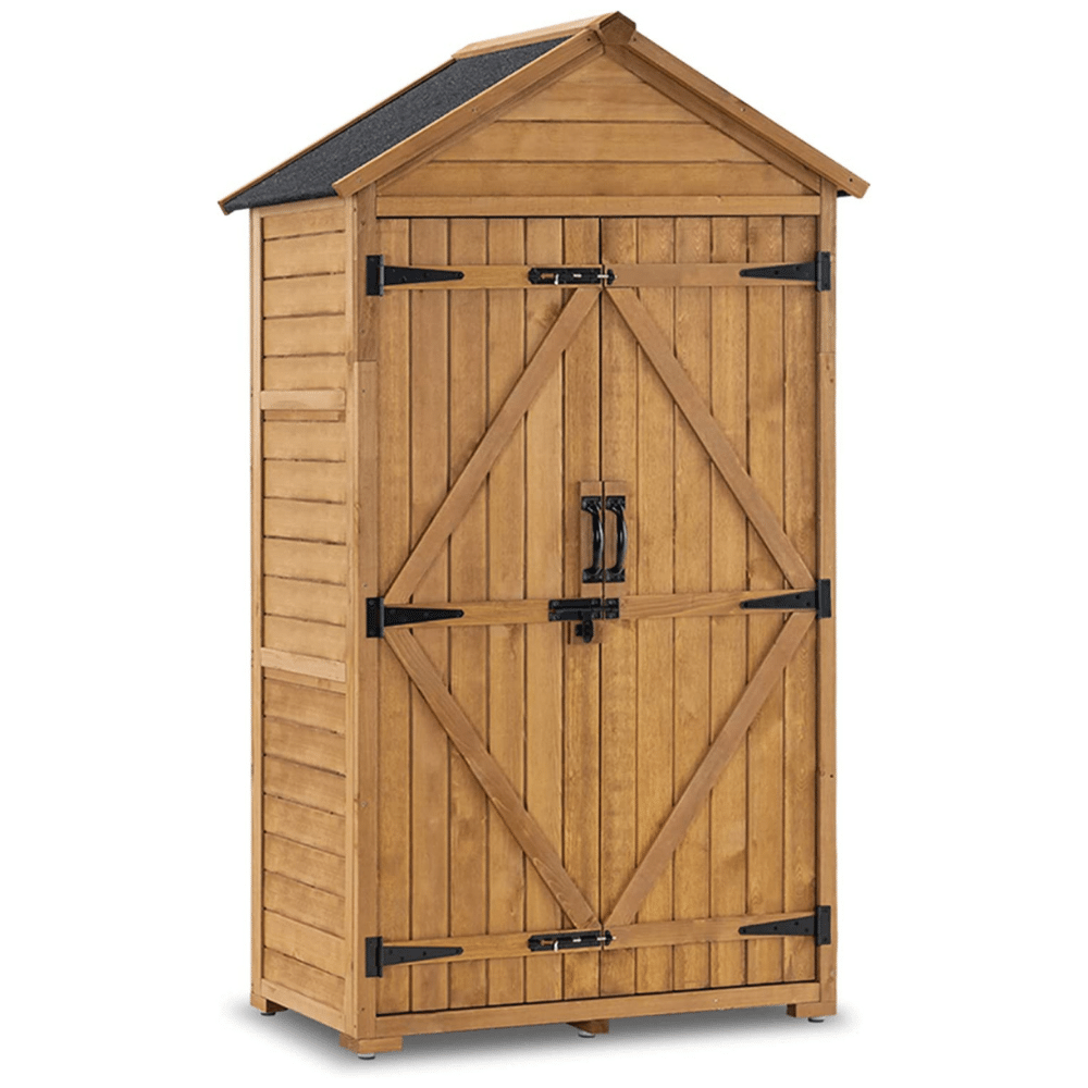 With its small size and large compartments, this Mcombo Outdoor Wood Storage Cabinet stores all of your tools while keeping them safe from harsh weather conditions so you don't have to worry about damage or rust creating an issue.