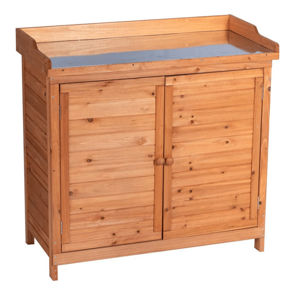 Not only can it store items like watering cans and hoses, but its unique size allows it to be used as an outdoor workbench too!